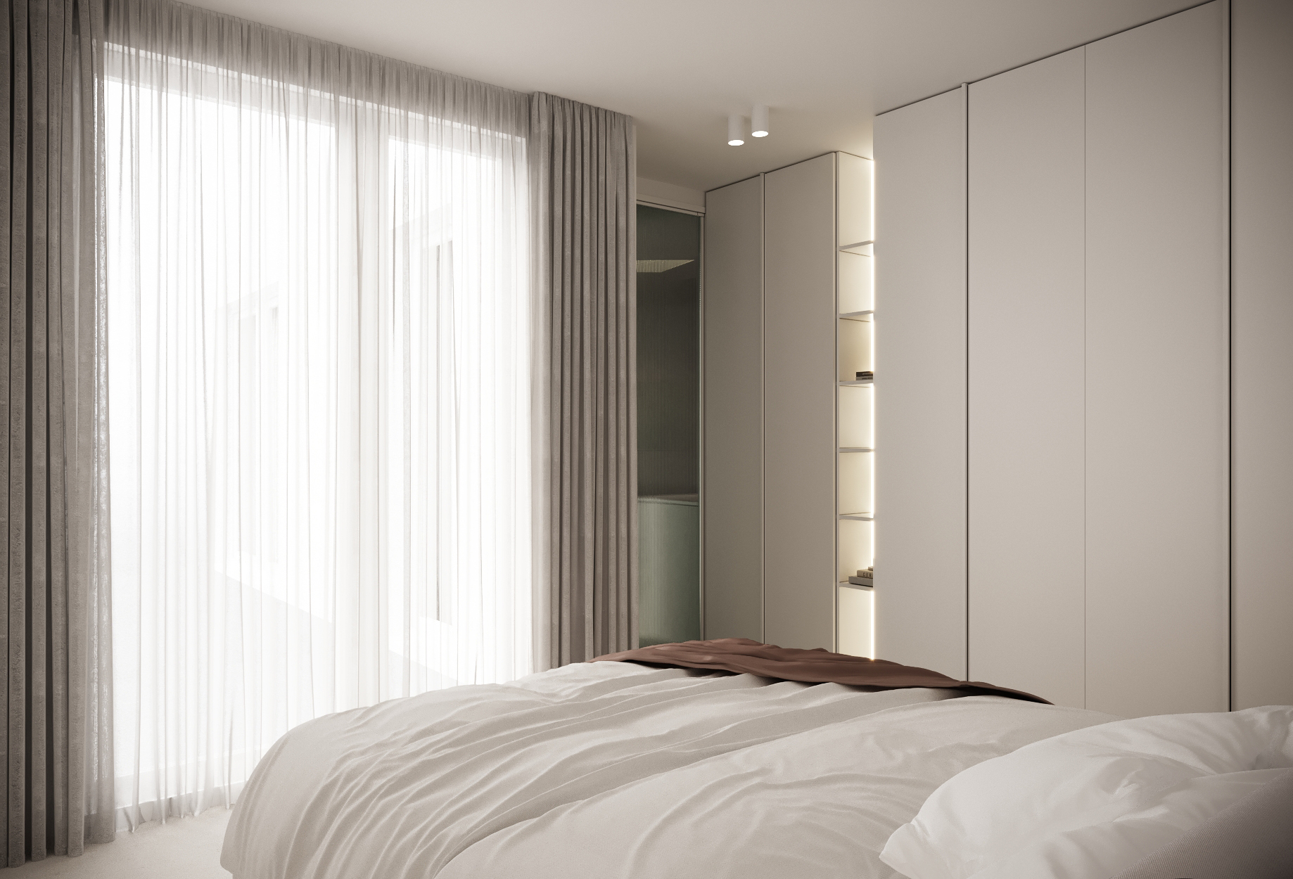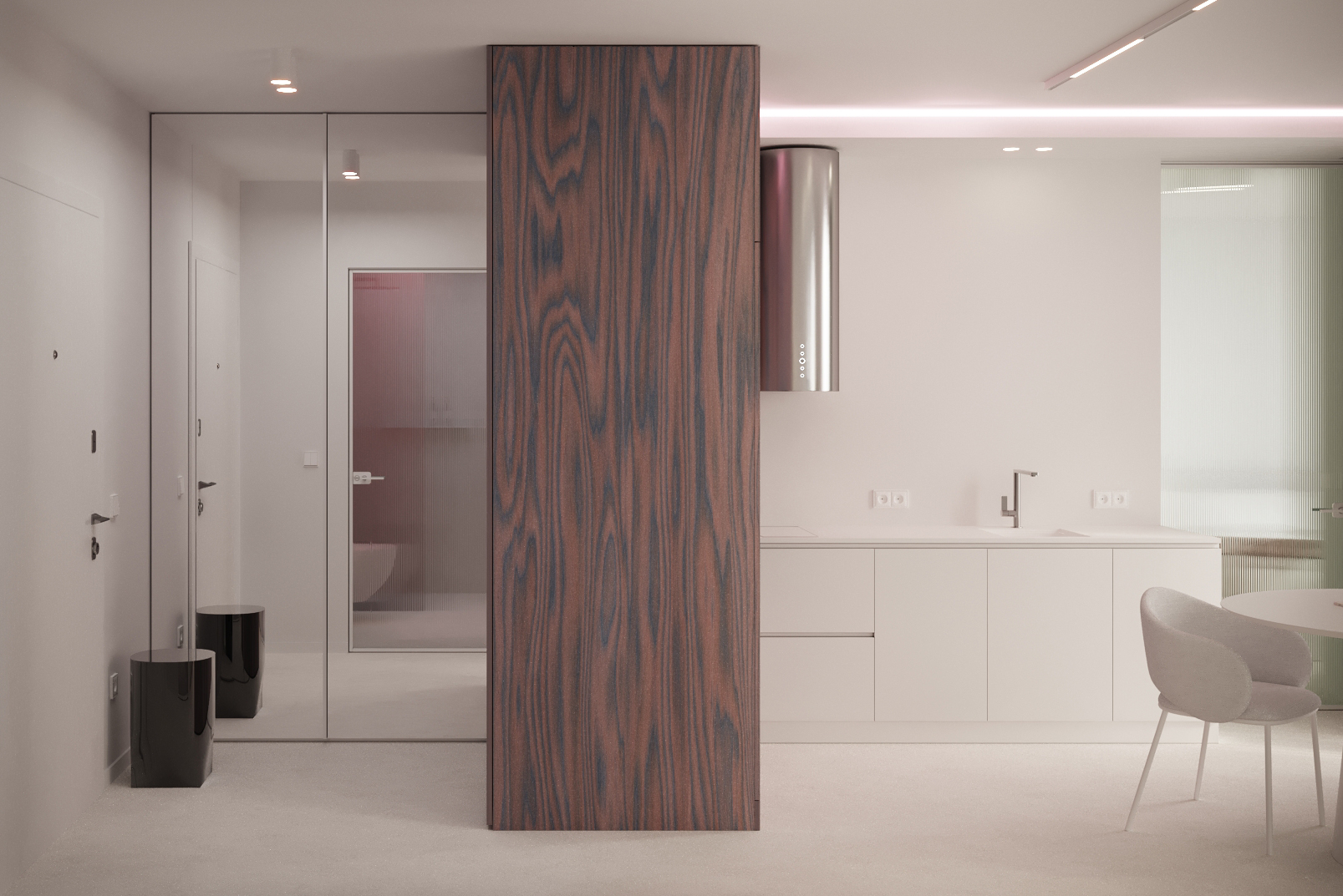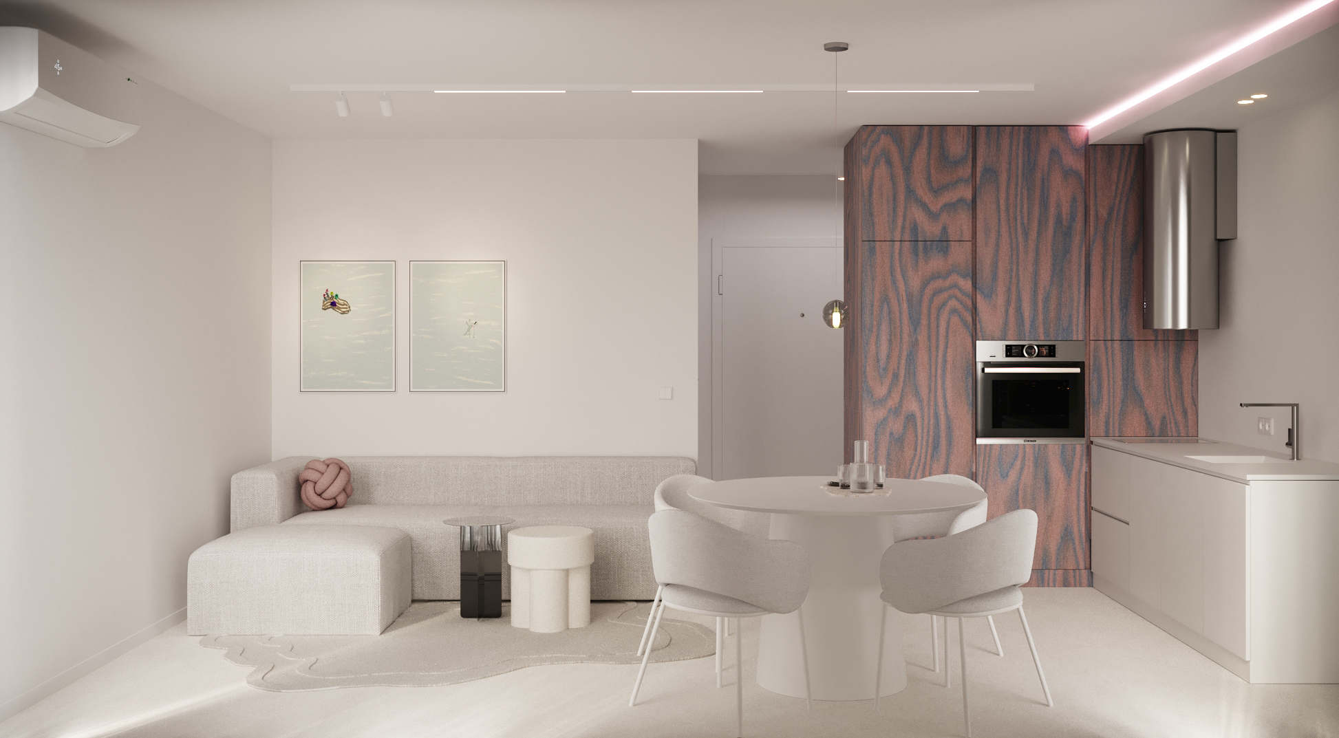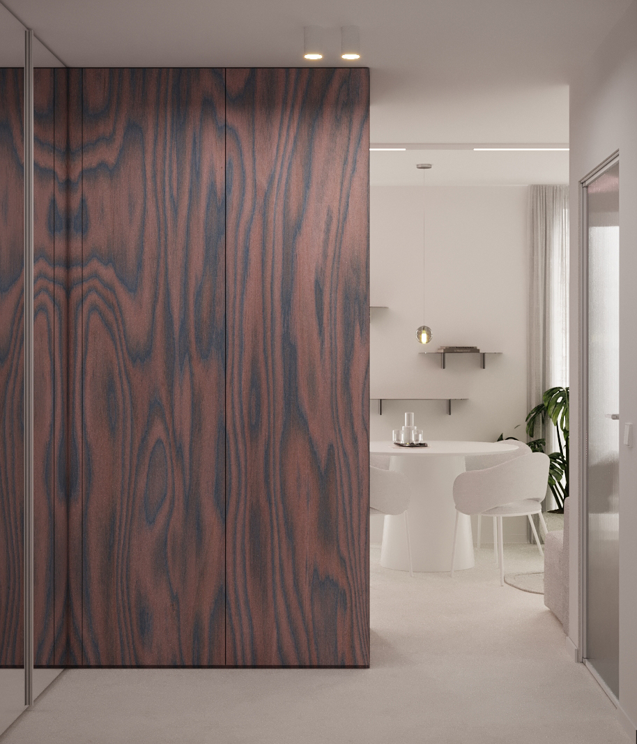 Основата е бяло пространство с под от микроцимент, което създава усещане за цялост и лекота. В този неутрален фон акцентният фурнир се превръща в основния „арт“ елемент – топъл детайл, който внася дълбочина и характер.