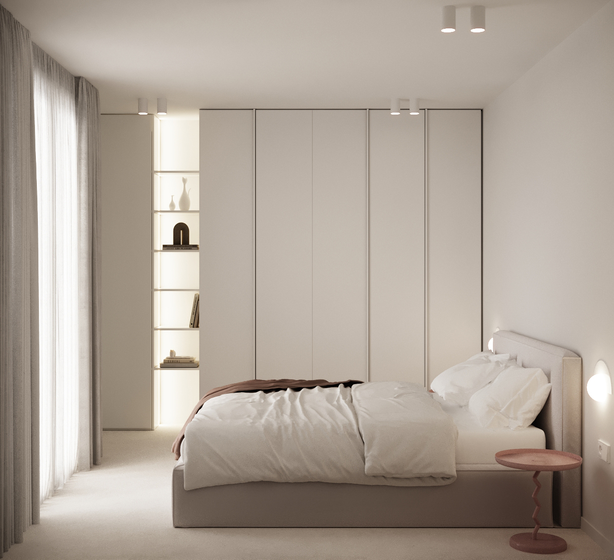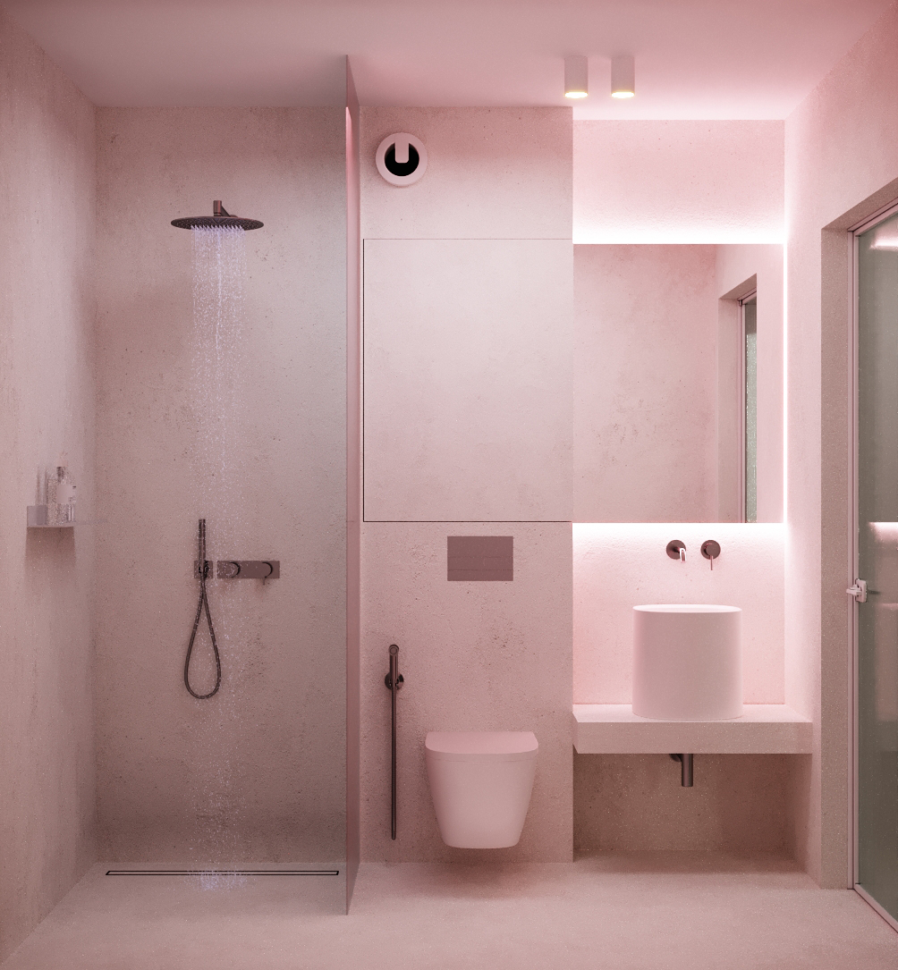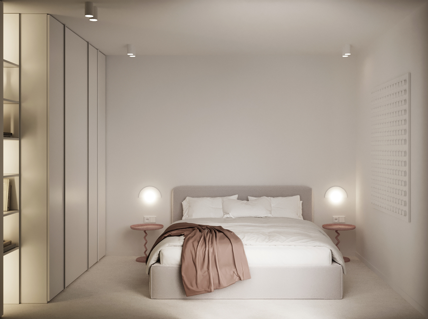 Основата е бяло пространство с под от микроцимент, което създава усещане за цялост и лекота. В този неутрален фон акцентният фурнир се превръща в основния „арт“ елемент – топъл детайл, който внася дълбочина и характер.